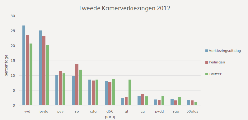 Op 20 maart gaat Nederland stemmen voor de provinciale staten en indirect de Eerste Kamer. Wij houden de stemming op Twitter bij. Hierboven staat de zetelverdeling in de Eerste Kamer gebaseerd op hoe vaak politieke partijen de laatste tien dagen op Twitter zijn genoemd. Bij de parlementsverkiezingen van 2012 bleek er een sterk verband te zijn tussen hoe vaak een politieke partij genoemd wordt op Twitter en hoe deze partij het doet in de peilingen. Zie ons artikel Relating Political Party Mentions on Twitter with Polls and Election Results en onderstaande grafiek.